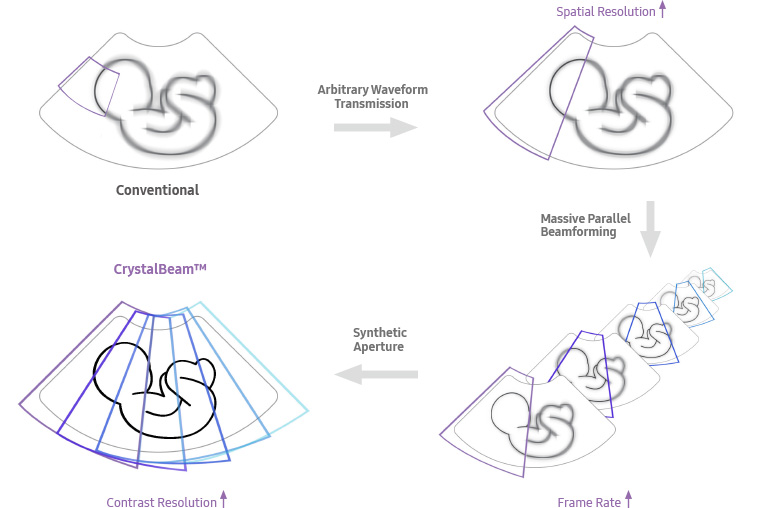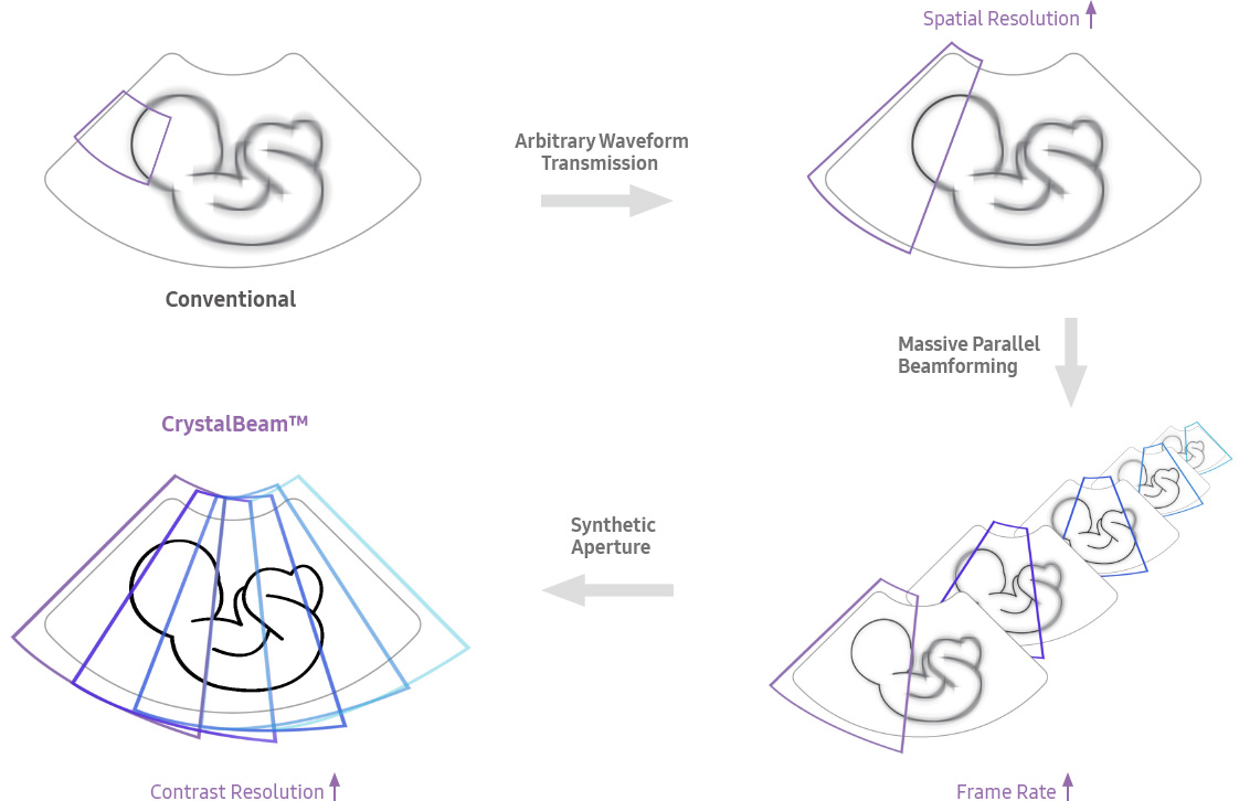 CrystalBeam verwendet Arbitrary Waveform Transmission, Massive Parallel Beamforming und Synthetic Aperture-Technologien, um eine schnellere Bildrate und eine verbesserte Bildhomogenität zu erzielen.