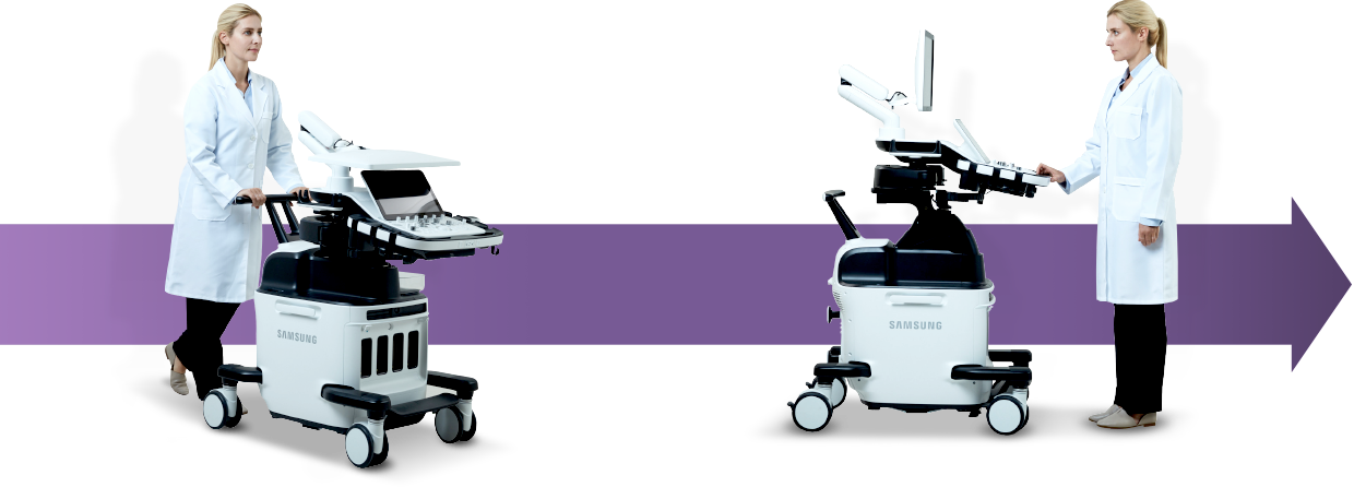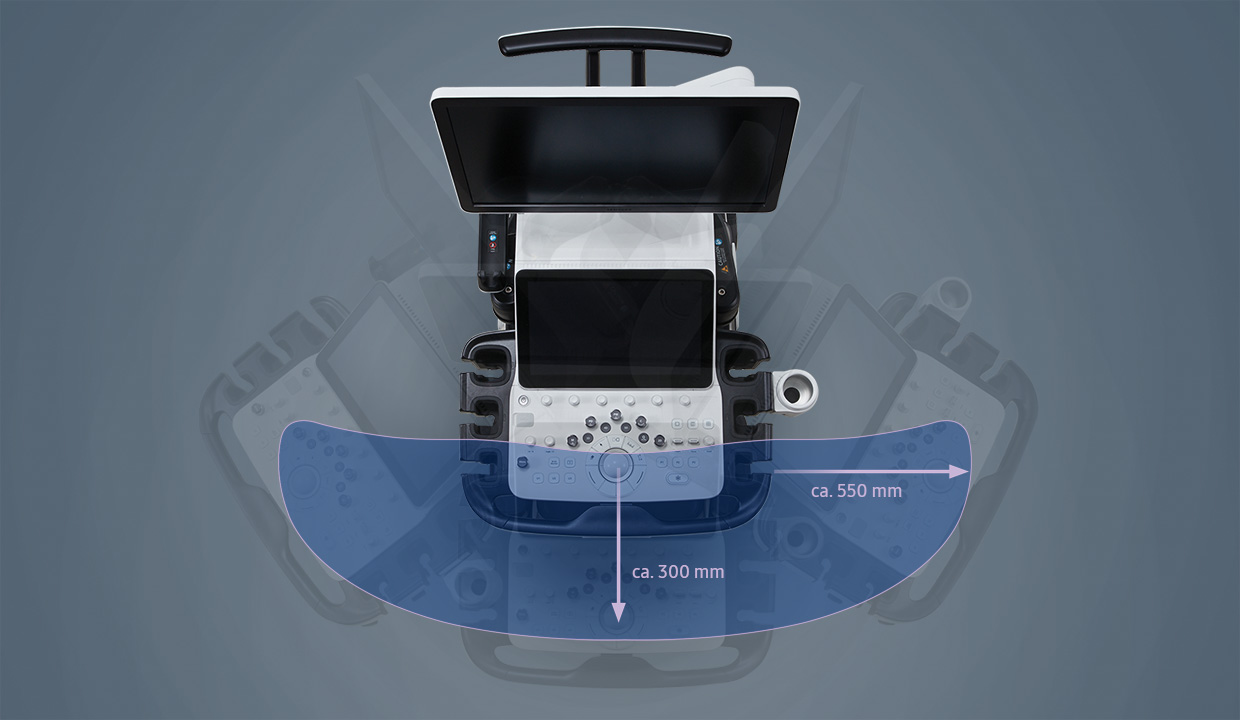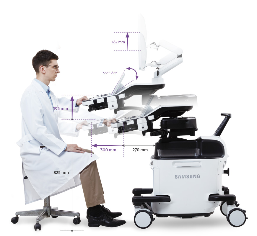 Mit FreeForm widmet sich Samsung einem Designthema, das Ihnen komfortable Arbeitsbedingungen bietet,indem unnötige Bewegungungen bei der Diagnosestellung verringert werden. Das Ziel von Samsung ist es, die Arbeitsumgebung des Benutzers durch weitreichende Einstellmöglichkeiten des Bedienfeldes, unter Berücksichtigung der Armreichweite, zu verbessern und ebenfalls eine angenehme Beinfreiheit zu bieten.
