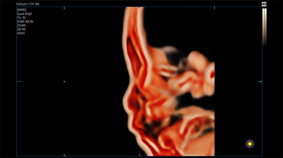 HDVI ist eine Volume-Rendering-Technologie, die die Visualisierung von Kanten und kleinen Strukturen in der Volumenbildgebung verbessert. Eine stärkere Kontrastierung und Bildsättigung ermöglichen eine detaillierte Darstellung des Feten.