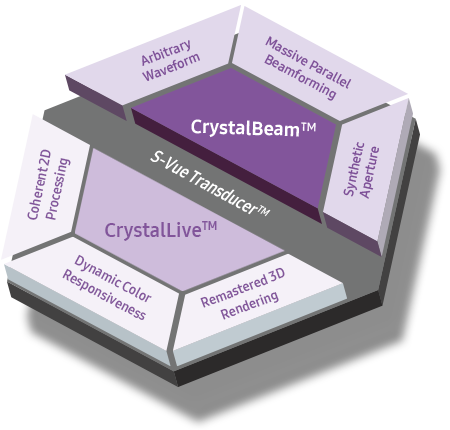 Crystal Architecture ist eine Bildgebungs-Architektur, die CrystalBeam, CrystalLive und S-Vue-Transducer-Technologie von Samsung miteinander kombiniert und somit kristallklare Bilder in hervorragender Qualität liefert.