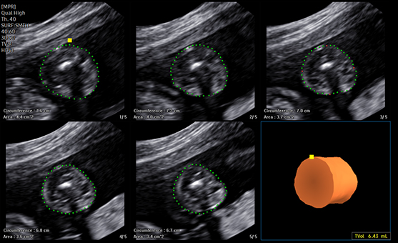 Durch das Setzen von lediglich drei Markern in nur einem Volumendatensatz ermöglicht das semi-automatische Tool 5D Limb Vol.™ eine einfache, schnelle und akkurate Messung der fetalen Extremitäten.