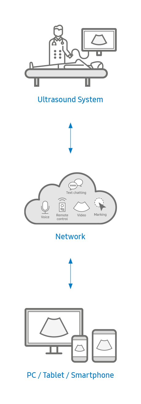 In addition, voice chatting, text chatting and real-time marking functions are provided for better communication; and the MultiVue function is included that allows monitoring multiple ultrasound images on a single screen.