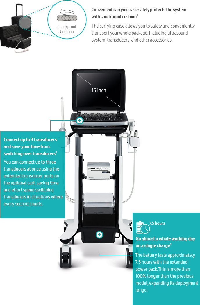 You can connect up to three transducers at once using the extended transducer ports on the optional cart, saving time and effort spend switching transducers in situations where every second counts.