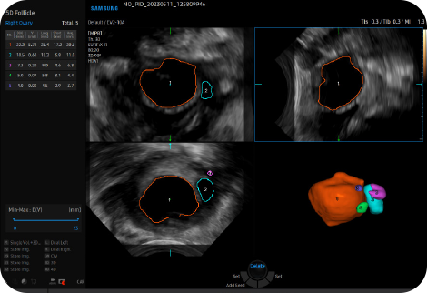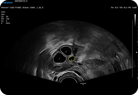 2D Follicle™은 부인과 검사 시, 여러 개의 난포 크기를 측정하고 상태에 대한 정보를 제공하는 기능입니다.