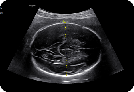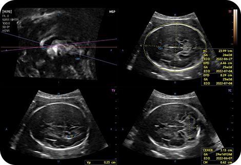 5D CNS+™는 지능형 내비게이션을 사용하여 태아 뇌의 3가지 횡측 뷰로부터 6가지 측정값을 자동으로 추천하는 기능으로, 최종적인 측정값은 의료진이 선택하여 측정의 재현성을 높이고 워크 플로우를 간소화하는데 도움을 주는 기능입니다.