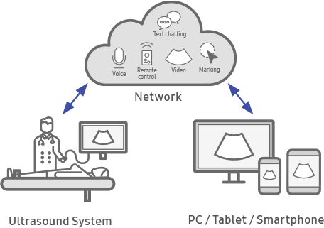 SonoSync™는 의사 또는 소노그래퍼와 의사 간의 진료 가이드 및 교육을 가능하게 하는 실시간 이미지 공유 솔루션으로 PC, 스마트폰 등에서 활용 가능합니다. 또한, 원활한 커뮤니케이션을 위하여 음성 채팅, 실시간 Marking 기능을 제공하며, 다수의 초음파 영상을 한 화면에서 모니터링할 수 있는 MultiVue 기능이 포함됩니다.