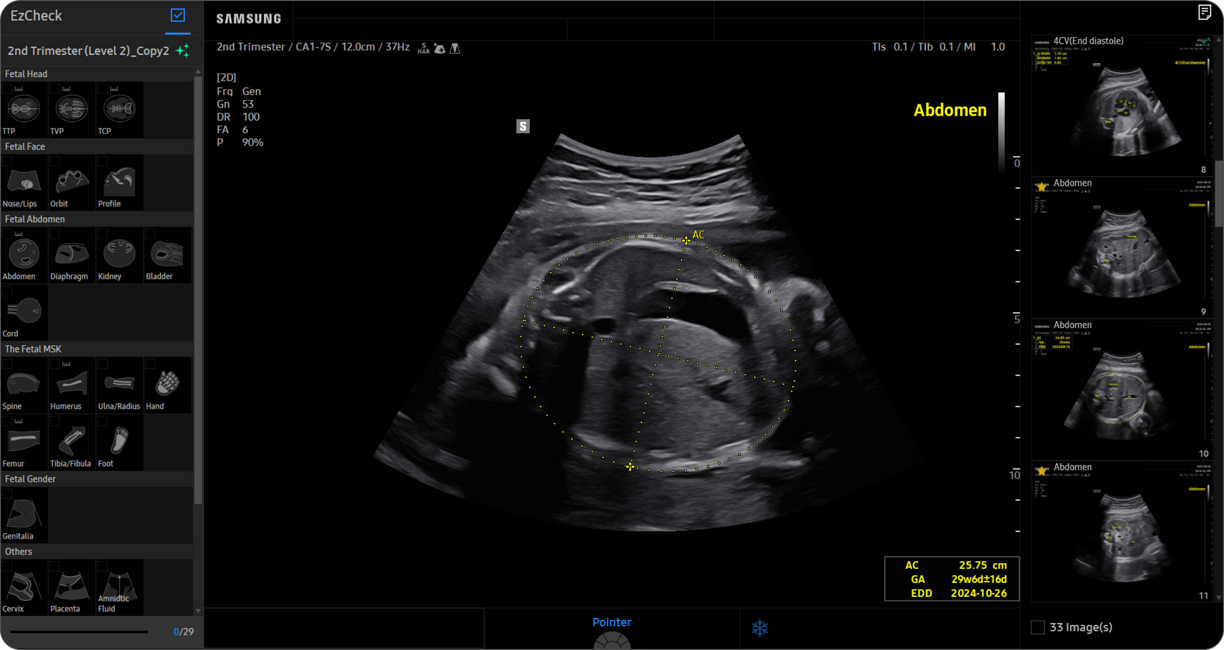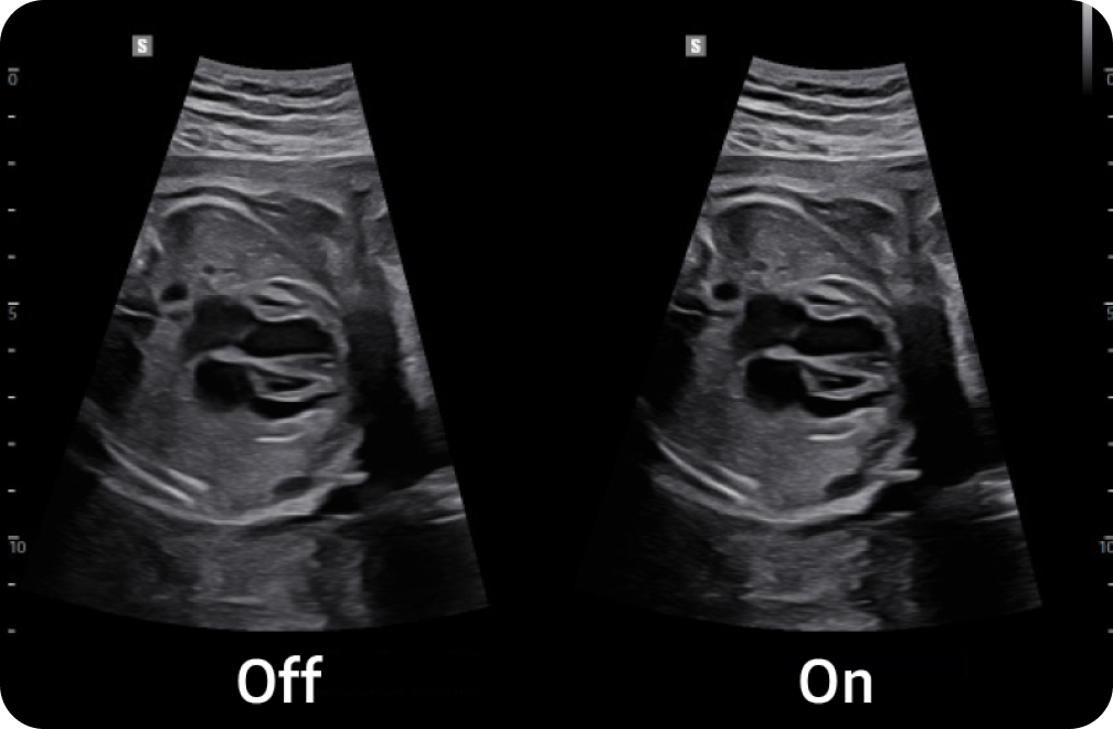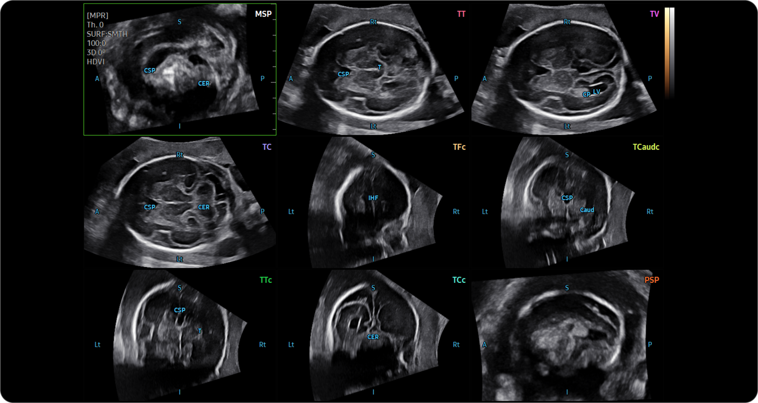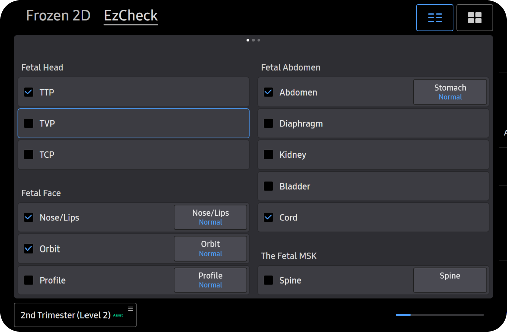 5D CNS+TM 1은 태아 뇌의 볼륨 데이터에서 9가지 단면을 검출하여, 6가지 측정값과 함께 자동으로 제공합니다. 최종적인 측정값은 의료진이 선택하여 측정의 재현성을 높이고 워크 플로우를 간소화하는데 도움을 주는 기능입니다.